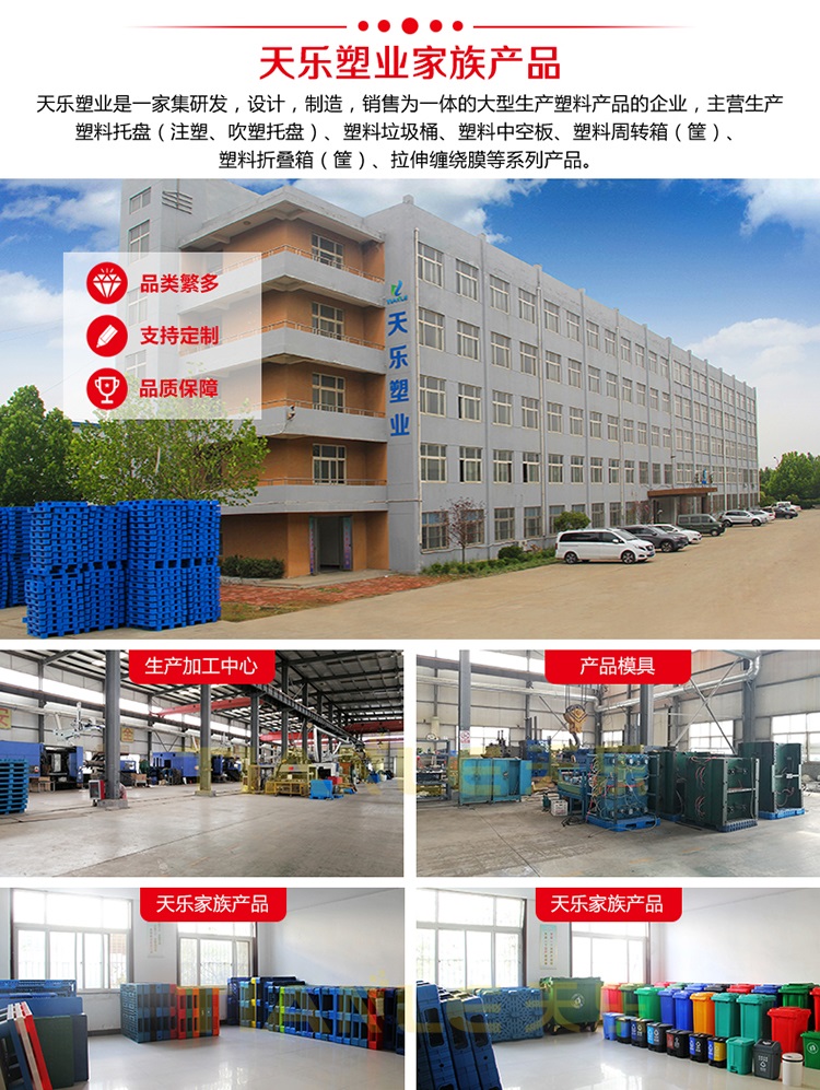 天樂塑業(yè)是一家集研發(fā),設(shè)計,生產(chǎn),銷售為一體的大型塑料制品的企業(yè),公司擁有大型注塑吹塑設(shè)備、托盤焊接設(shè)備十多臺,截止目前產(chǎn)品模具多達七八十種,產(chǎn)品規(guī)格品類繁多,公司擁有經(jīng)驗豐富的設(shè)計研發(fā)人才、設(shè)備維保技師,可提供產(chǎn)品顏色、重量、logo等定制服務(wù)、代加工服務(wù)。公司主營生產(chǎn):塑料托盤、塑料垃圾桶、塑料周轉(zhuǎn)箱(筐)、塑料折疊箱、PP中空板、拉伸纏繞膜等系列產(chǎn)品。